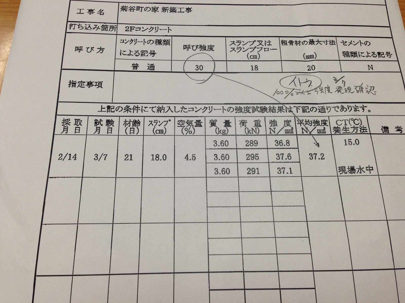出てほしい強度(呼び強度)が30N/mm2に対して,試験結果は37.2と3週間の段階で良い数値出ました.