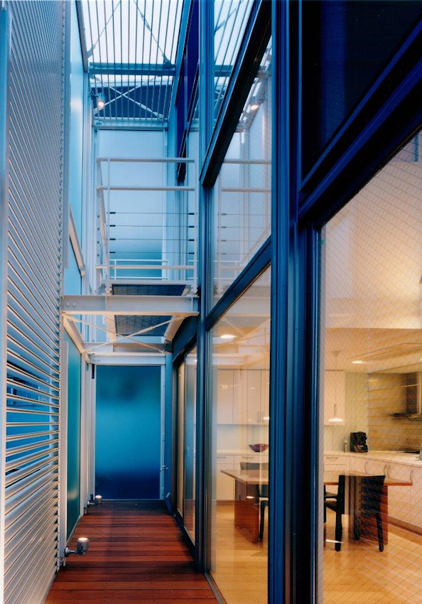 ポリカ複層板とガラスのダブルスキンの壁面が家族のスペースに光を取り入れます。
